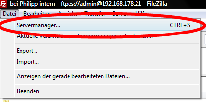 Zunächst starten wir Filezilla und klicken unter "Datei" ► "Servermanager". Hier können wir die Verbindungsdaten zu unserem FTP- Server eingeben.