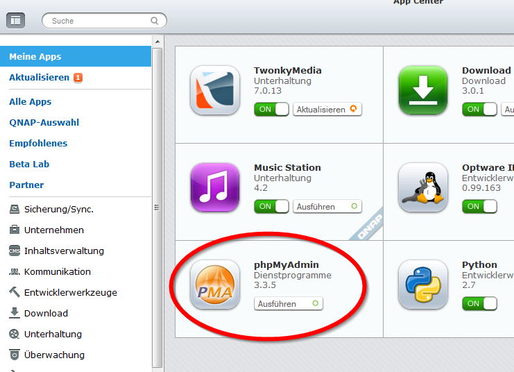 - Alternativ können wir phpMyAdmin auch über das App- Center aktivieren: