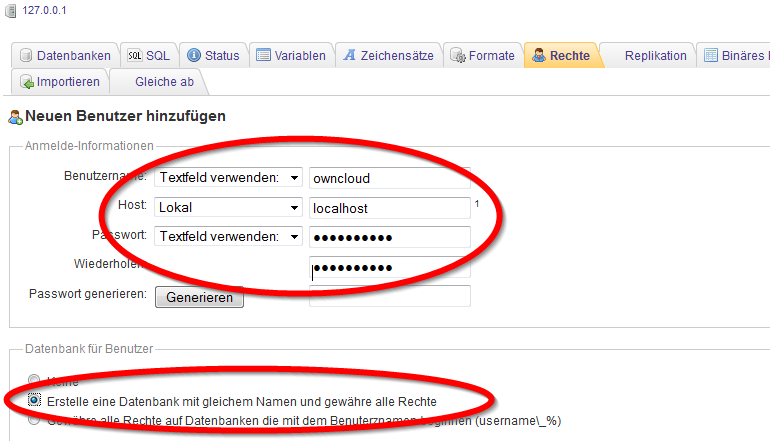 Wenn wir uns im phpMyAdmin eingeloggt haben, gehen wir bei den oberen Reitern auf "Rechte" und fügen einen neuen Benutzer wie folgt hinzu: