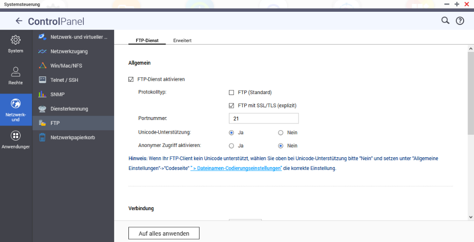 Zunächst schalten wir auf dem QNAP den FTP- Server ein: